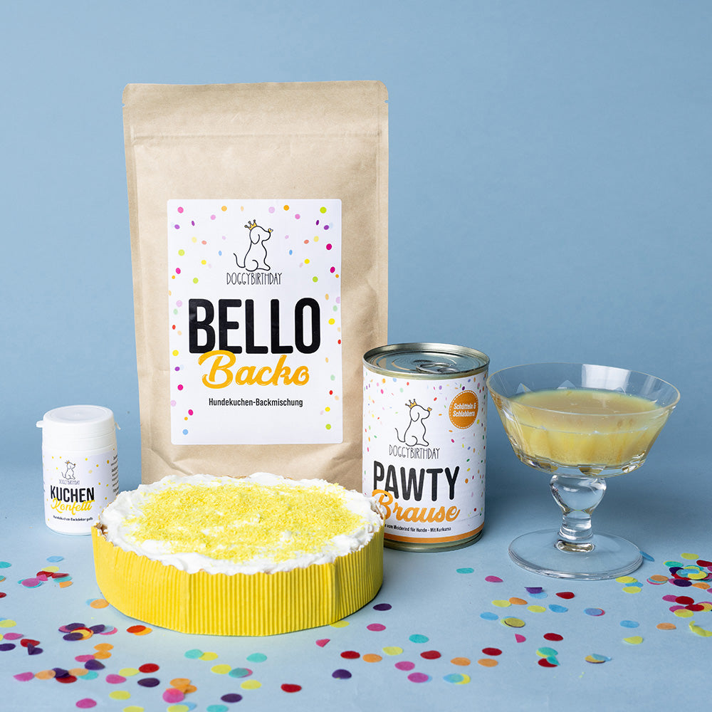 Unser Golden Pawty-Paket sorgt für eine wahre Pawty-Explosion bei allen Birthday-Dogs! Denn es enthält alles, was ihr für eine Pawty mit ordentlich Glitter & Glamour benötigt: Unser Geburtstagskuchen Back-Set mit einer gelben Papierbackform, das farblich passende Kuchen-Back-Dekor sowie die Golden Pawty-Brause zum Anstoßen!
