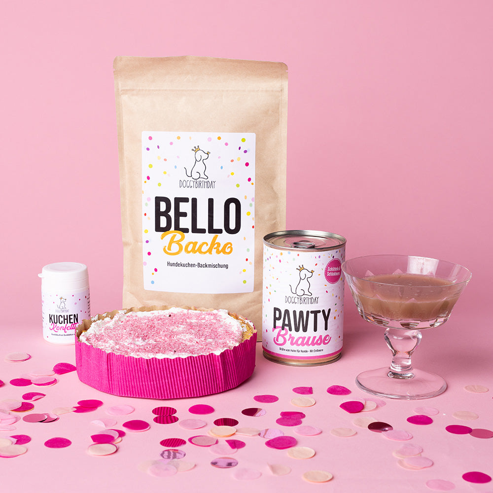 Unser Geburtstagskuchen Back-Set mit einer pinkfarbenen Papierbackform, farblich passende Kuchen-Konfetti sowie eine Pawty-Brause mit Erdbeere zum Anstoßen!